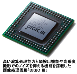 画像処理回路には最新の「DIGIC III」を採用。「DIGIC III」によって、被写体の顔を常時検出してピントや適正な露出を設定する「フェイスキャッチテクノロジー」、最大ISO1600の感度で手ブレや被写体ブレを抑える高感度撮影も実現した。