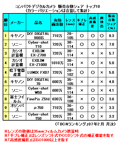 高機能化が進むコンパクトデジタルカメラ。時には週変わりで売れ筋上位の顔ぶれが変わるほど競争が激しい市場で、トップの座についたのがキヤノンの「IXY DIGITAL 900IS」だ。「BCNランキング」2月のコンパクトデジカメ部門で、カラーバリエーションを合算して集計した販売台数シェア8.3%を獲得し1位に輝いた。「広角ズームレンズ」「手ブレ補正」「高感度撮影」「顔検出」というコンパクトデジカメ市場でトレンドの機能をすべて盛り込んだことがユーザーに支持された。
