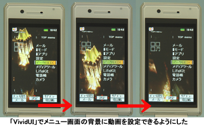デザインのこだわりは外面だけでなく、インターフェイスにも及んだ。「DVDレコーダーのメニューのようなイメージでAV機器を連想させたかった」(同)という狙いから、3Dアニメーションなどの表示が可能な「VividUI」というエンジンを採用。メニューの背景に動画を流せるようにした。
