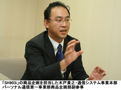 しかし、価格だけを見れば、他社の「903i」シリーズ端末も条件は同じ。その中で、多くのユーザーから支持を集めることができたのは、ドコモ向けの端末を担当し、「SH903i」を企画した木戸貴之・通信システム事業本部パーソナル通信第一事業部商品企画部副参事がMNP(番号ポータビリティ)を見据えて打ち出した戦略だった。