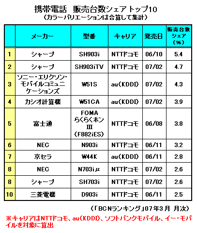 3月はケータイ商戦の天王山と言われている。新入学生、新社会人が多く、1年で最も契約者が多いのがこの月だからだ。1番の人気を集めたのはシャープの「SH903i」。NTTドコモから発売されている第3世代携帯電話「FOMA」の端末だ。「BCNランキング」でカラーバリエーションを合算して集計した3月の携帯電話の販売台数でシェア5.4%を獲得し、1位に輝いた。