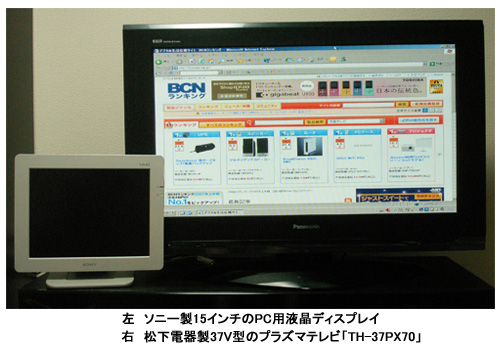 今回接続に使用するのは、03年3月に購入した15型液晶ディスプレイが付属するソニー製のデスクトップPC「VAIO RZ51」と、07年4月発売で7月に買ったばかりの松下電機製の37型プラズマTV「TH-37PX70」。プラズマTVは最新型だが、PCが4年以上前の製品でやや不安だ。TVが高かっただけに余計にプレッシャーがかかる。しかし、成功すればPC付属の15インチの液晶ディスプレイから37V型の超大画面が実現する。