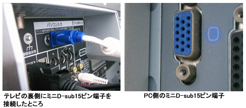 まずは端子の確認。TV側は説明書からすぐに「ミニD-sub15ピン端子」を搭載していることが判明。一方、PCのほうは4年前の説明書が行方不明。いまさら見つかるわけもなく、なんとかメーカーのホームページで製品情報を発見したのだが、そこには「ミニD-sub15ピン」ではなく、「D-sub15ピン」という記載があった。いきなり変換コネクタを買わねばならないのかとブルーになった瞬間だった。