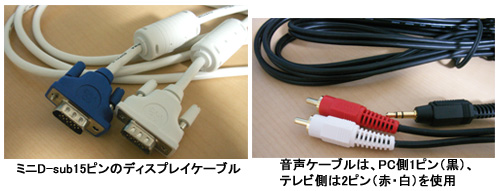 端子の問題が解決したところで「ミニD-sub15ピン」に対応したディスプレイケーブルと音声ケーブルを購入。見落としがちだが、ディスプレイケーブルが伝送できるのは映像信号だけ。PCの音をTVから出すには別のケーブルが必要になる。映像だけだとTVでPCを操作できても音はPCから聞こえるという寂しい状況になってしまう。