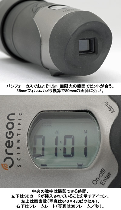 製造元の米Oregon Scientificによると、レンズはパンフォーカスでおよそ1.5m-無限大の範囲でピントが合うよう設計されており、35ミリフィルムカメラ換算で80mmのレンズの画角に近いという。しかし、そうはいっても、通常は撮っている映像を見ながら撮影するので、うまく撮れるが心配になってしまう。イメージ通り撮影したい場合は、事前に試し撮りをするとよいだろう。