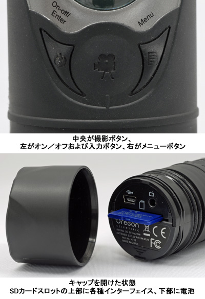 外部メモリはSDカードで、本体後部のキャップを開けたところにスロットがある。画素数とフレームレートによって撮影時間は異なるが、2GBのSDカードの場合、「640×480ピクセル」「30フレーム/秒」でおよそ1時間撮影できる。このほか、32MBのメモリを内蔵している。メモリカードスロットと同じ面にテレビやPCと接続するインターフェイスを備え、乾電池もここに装着する。電源は単3形乾電池2個。