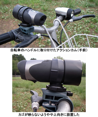 さて、実際の撮影動画を見てみよう。まず、自転車で走行中の撮影に挑戦した。出発前に、元々付いていたベルを外してハンドルの右側にカメラを装着した。当初、自転車の前方に取り付けてあるカゴが一緒に映ってしまうと格好が悪いと思い、カゴを取り外す予定だった。しかし、結局カゴがうまく外れなかったのでそのままにし、カメラをやや上向きに設置した。