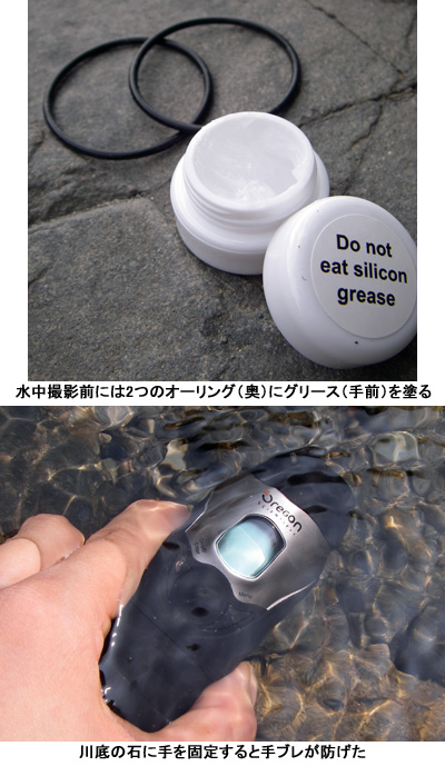 次に、「ATC-2K」の防水仕様を生かして水中撮影に挑戦した。水中撮影の前には、付属するゴム製のオーリングにグリースを塗ってキャップの溝に装着する。キャップを閉める前にも再びオーリングの上から塗り、これで水が内部に侵入するのを防ぐ。撮影場所は、澄んだ水中を撮りたいことから、東京・青梅市の御岳渓谷にした。合計撮影時間はおよそ20分。その中で、小魚が泳ぐ姿をうまくキャッチできた動画がこちらだ。【動画2:御岳渓谷で泳ぐ魚の映像をキャッチ】