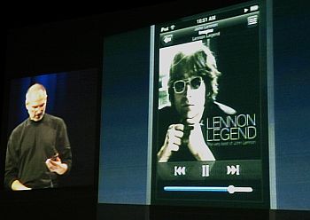 また、iTunesに収録した楽曲の中から任意に30秒を切り出して、「iPhone」の着信音にすることもできるようになることも紹介。「iPhone」の着信音は、電話をかけてきた相手によって変えることができ、ジョブズCEOは自らそのデモを行ってみせた。そこで彼が「これは、NBCからの着信音にしよう」と言うと、会場は大爆笑。