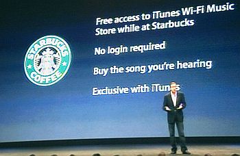 米国では、スターバックスのコーヒーショップで、無料で無線LAN接続が使えるようになる。ジョブズCEOが、スターバックスコーヒーの発起人でありチェアマンでもあるハワード・シュルツ氏をステージに招き入れると、シュルツ氏は、アップルとスターバックスの2年間に及ぶ交渉の成果をアピールした。