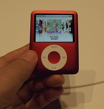 まず、気になっていた「iPod nano」のかたちをチェックしてみた。ビデオやアップルのWebサイトで見ると、ずいぶんずんぐりしているように感じられるのだが、実際に手にとってみると、意外に小さく軽いので、スクエアデザインもすんなり受け入れられた。むしろ、従来の縦長の「iPod nano」をスタイリッシュと表現するなら、新しい「iPod nano」は「かわいらしい」という表現がぴったりだ。ジョブズCEOが自慢していたように、ディスプレイは確かに高精細で、ビデオ再生時も十分に美しい。「iPod mini」から続くこのカテゴリーは、新しいiPodファミリーの中でもまた、セールスのボリュームゾーンになりそうだ。