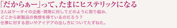 | この仕事はケータイの全部に関わることができる。私はそこが一番好きです。どういうものが作りたいってところから、どうやって売っていくかというとことまで、すべて見ることができるので。 |