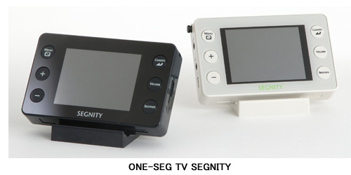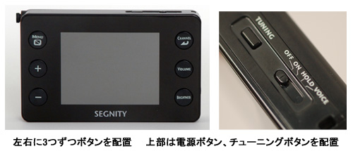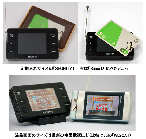定期入れサイズの「SEGNITY」は片手で持つことができるので、通勤・通学途中の電車の中でもワンセグ放送を視聴できる。カバンどころか、ポケットにも入るサイズだ。液晶サイズは2.7型で、最新の携帯電話のメインパネルと同じ程度の大きさ。「ポータブルテレビ」としてはやや小ぶりだ。液晶パネルの左右に3つずつの操作ボタンが配置されている。