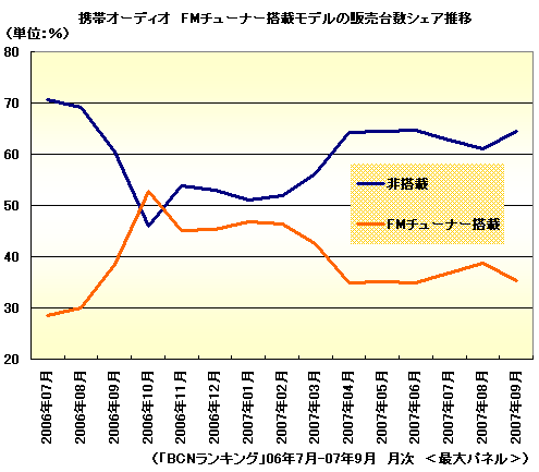 ラジオ事情を知る手始めとして、まず携帯オーディオのラジオチューナー搭載状況を調べた。06年7月から07年9月の「BCNランキング」で、携帯オーディオにおけるFMチューナー搭載モデルの販売台数推移を見てみると、当初は、FMチューナー搭載モデルと非搭載モデルの割合はおよそ3対7だった。