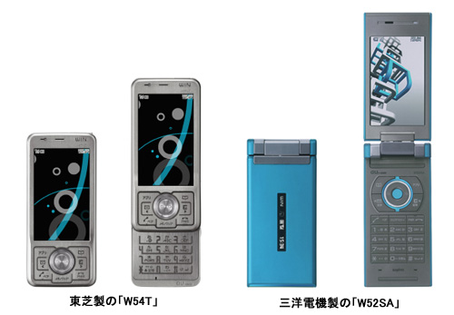 KDDI(au)で東芝製の端末「W54T」は、FMラジオのほか、デジタルラジオやワンセグも視聴できるモデル。SDカードスロットを装備し、外部メモリにFMラジオを1回につき最大120分録音できる。ラジオの放送中に流れる楽曲やアーティストに関する情報を画面で確認でき、ダウンロードできる楽曲があれば表示する機能も備える。また、同じくauで三洋電機製の端末「W52SA」も、FMチューナーを搭載する。イヤホンアンテナなしで、FMラジオをスピーカーから聴けるのが特徴。内蔵メモリに最大約120分の録音ができる。