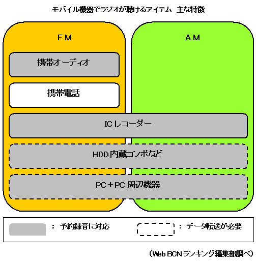 一方、AMが聴けるものは、ICレコーダー、HDD内蔵コンポなど、PCとラジオチューナーなどのPC周辺機器の組み合わせ、となっている。ただ、ICレコーダーも、FM・AMラジオチューナーを搭載する機種が大変少なく、選択肢が限られてくる。PC周辺機器も同様に製品自体が少ないので、製品の数が豊富なものとしてはHDD内蔵コンポということになる。ただ、HDD内蔵コンポとPC+PC周辺機器は、録音したデータをモバイル機器に転送しなければならないので一手間かかる。