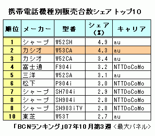 「EXILIMケータイ」は、その名称からわかるとおり、デジカメ機能に徹底的にこだわった携帯電話だ。カシオ計算機の薄型デジカメブランド「EXILIM」のブランド名を冠した本格的なデジカメケータイで、有効画素数は約515万画素。現在販売されているケータイのなかで最高レベルで、単機能のデジカメ並みの写真が撮れるのが特徴。直近10月第3週(10月15-21日)の携帯電話機種別販売台数シェアでは、トップはシェア4.9%でシャープの「W52SH」が獲得。それを追いかけるのがシェア4.3%で2位につけている「EXILIMケータイ」の「W53CA」だ。