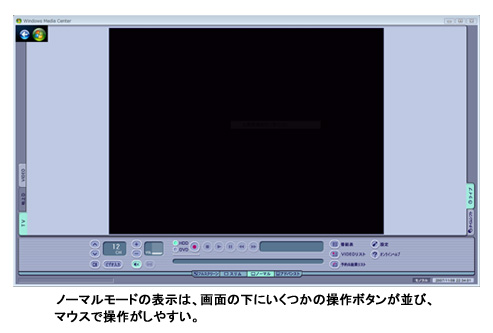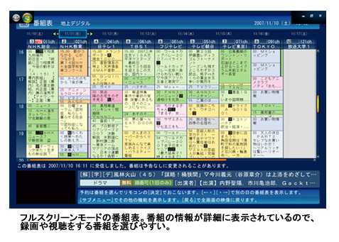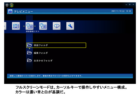 テレビ視聴ソフトのモードは大きく分けて2つ用意されており、「フルスクリーンモード」と「ノーマルモード」がある。ディスプレイをフルに使ってテレビの画面を表示し、メニューなどは隠しておくのが「フルスクリーンモード」で、リモコンからの操作がしやすい。番組表やその他のメニューも、文字が大きく、濃い青に白い字を使うなど、コントラストを強くしている。少し離れて画面を見るのに最適だ。また、メニューの構成は、基本的にカーソルキーで操作すればこと足りるようになっている。