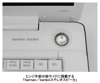 「AX/55D」は、東芝のスタンダードノートPC「AX」シリーズの最上位モデルだけあって、サウンド機能も充実。世界的なオーディオメーカーのHarman International社と共同開発した「harman/kardonステレオスピーカ」を内蔵する。同社のAVノートPC「Qosmio」シリーズでも採用するスピーカーで、低音域から高音域までをカバーする「ワイドレンジ再生」が可能。