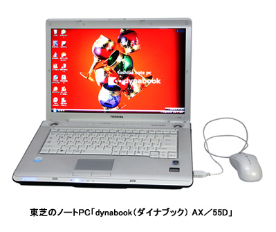 ノートPC「dynabook(ダイナブック) AX/55D」を起動してまず感じるのは、画面の美しさ。色純度72%の鮮やかさと、輝度490cd/m2の明るさをもつ15.4型ワイド液晶で、同社のAVノートPC「Qosmio(コスミオ)」シリーズでも採用する「高色純度・高輝度Clear Superview液晶」が特徴だ。