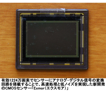 Exmorは高画素だけではなく、ノイズ低減にも力が注がれている。アナログ信号をデジタル信号に変換する回路をセンサーに搭載。信号をセンサー上で全てデジタル化することでセンサーから画像処理回路に送る画像データの劣化を防いだ。