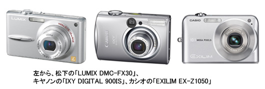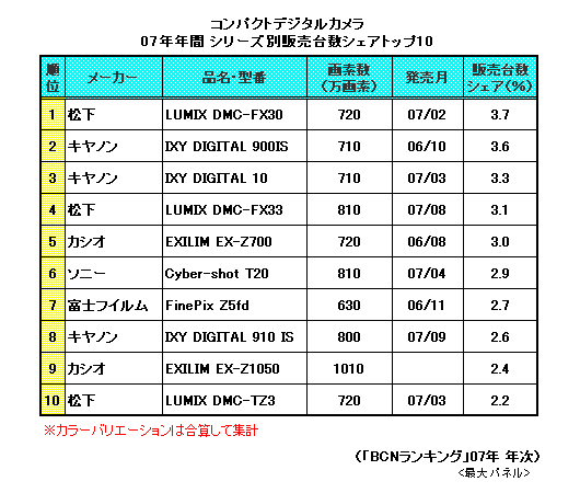 まずはコンパクトデジタルカメラから見ていこう。1位を獲得したのは、07年2月発売の松下の「LUMIX DMC-FX30」。シェアは3.6%。2位にはわずか0.1ポイント差でキヤノンの「IXY DIGITAL 900IS」がつけた。集計期間の関係上、4位の「LUMIX DMC-FX33」を除き、トップ10は、すべて06年後半から07年前半に発売されたもの。有効画素数は700・800万画素クラスが多い。有効画素数1000万画素以上のモデルでは、全体で9位のカシオの「EXILIM EX-Z1050」が最も売れたカメラだった。