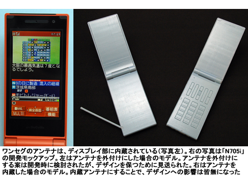「amadanaケータイ」のデザインは、さまざまな技術的な課題をクリアした結晶だ。例えば、ワンセグ用のアンテナは、当初は外付けタイプを検討していたが、「それではデザインが崩れてしまう。そこでアンテナを内蔵型にすることで、結果的にワンセグを搭載できるようにした」(有田マネージャー)という。