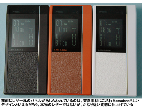 デザイン家電のamadanaは、天然素材をふんだんに使うことが特徴の1つになっている。amadanaケータイでも、その考えは受け継がれており、端末の前面にはレザー風のパネルをあしらった。パネルは一見すると、本物の革のように感じるほどの質感だ。これも「レザーやウッドの質感をいかにして取り入れるか考えて、本物に近いところまで持っていった」(有田マネージャー)という努力で実現した。