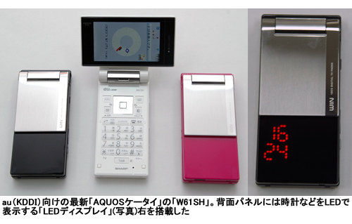 au(KDDI)向けではデザイン性を追求した。「W61SH」は、「女性もターゲットにできるAQUOSケータイ」を狙った端末。女性がカバンなどに入れやすいサイズと親しみやすいデザインにこだわった。
