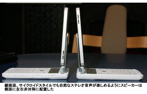 特にこだわったのは「サイクロイドスタイル」。自社の調査で判明した、電車の中などで大きな横画面でワンセグを見たいというユーザーニーズから生み出した。スィーベル(2軸回転)など数十種類の構造が俎上に上がったが、「満足できる端末には仕上がらなかった」(吉高部長)。検討を重ねた結果、採用されたのがサイクロイドだった。
