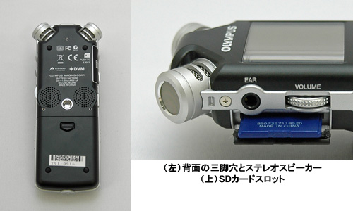背面にはステレオスピーカーに加え、三脚穴を装備。手持ちだけでなくマイクの角度を固定して録音することもできる。記録媒体は2GBの内蔵メモリと、外部メモリのSD/SDHCカードに対応。カードスロットは左側面の上部に備える。なお、貸出機のせいか、SDカードのメーカーによってはカードを取り出す際に抜けにくくなるものがあった。