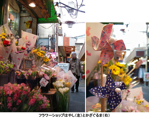 日が傾きかけた頃、自然に足が向いたのがJRの線路の北側にある商店街「ハーモニカ横丁」。小さな店が細い路地を挟んでひしめき合う、どこか懐かしい空間だ。目に留まったのは生花店「フラワーショップはやし」の店先に飾られた、小さな2つのかざぐるま。この回転音を収録した。収録位置はかざぐるまの真横、1cm程度。ちょうど3人の親子が、お母さんの誕生日に花束をプレゼントするために訪れていた。