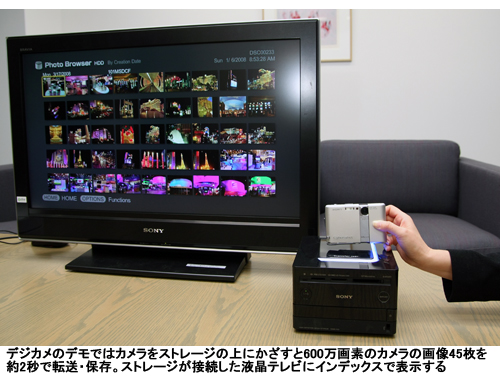 デジカメのデモではトランスファージェットの回路を搭載したデジタルカメラを、同じく回路を積んだストレージに置くと、画像全てを転送・保存。薄型テレビにインデックスで表示される。転送する写真は600万画素で枚数は45枚。転送時間はわずか約2秒だ。