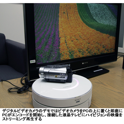 一方、デジタルビデオカメラのデモは、回路を組み込んだビデオカメラを回路搭載のPCに置くと、1440×1080画素のハイビジョン映像をPCに送り、PC経由で薄型テレビにストリーミング再生する。6.5秒で転送は完了する。