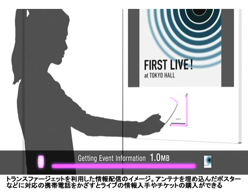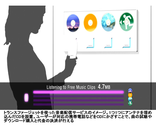 ソニーでは機器同士のデータ転送だけではない利用方法も狙っている。その1つが音楽配信。例えば1つ1つにアンテナを埋め込んだCDのを設置。ユーザーが対応の携帯電話などをCDにかざすことで、曲を試聴して、気に入れば曲をダウンロードする。その後、代金を決済するといった具合だ。