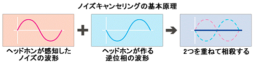1つ目のメリットである強いノイズキャンセル効果についてだが、角田氏によるとノイズキャンセルにはまず「ヘッドホンが周りのノイズを検知し、リアルタイムで逆位相の音を送り出す」ことが必要。「MDR-NC500D」内部にはマイクがあり、これが耳元のノイズと音楽が混じった音を認識すると同時に、ヘッドホンの入力プラグから来る、純粋な音楽信号との比較を行う。こうすることでノイズの成分が明らかになるわけだ。