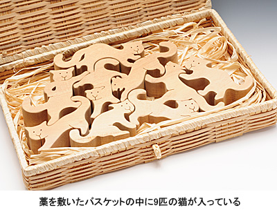 「ネコの自由積木」は木製で猫の形をした積み木。鳥の巣のように藁を敷き詰めた、B5ほどの大きさのバスケットに入っている。思い思いのポーズとそれぞれ異なる表情。1つひとつを見ているだけでも楽しい。9匹の形はある程度計算されていて、バスケットにきちんと収めるための組み合わせがいくつかある。これはこれでパズルとしても楽しめる。