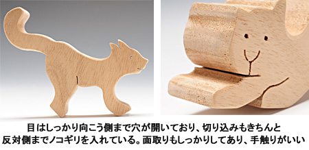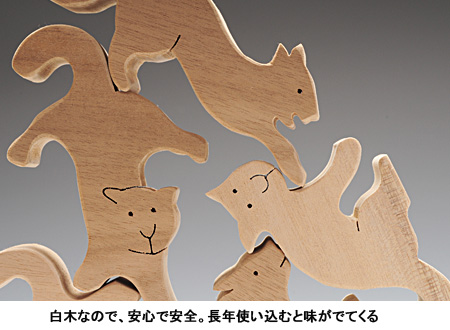 白木なので買ったばかりの状態では白っぽくて味気ない。しかし、何年も使い込んでいくうちに味のある色になっていくという。デジタルなおもちゃにはありえない積み木ならではの楽しみだ。もちろん色を塗ったり、シールを貼ったりしてもいい。また、積み木として使うときは、必ずしも9匹全部に登場してもらう必要はなく、1匹2匹で組み合わせても遊べる。左右の向きの違いや見る角度によって表情が微妙に変わるのを眺めて楽しむこともできる。