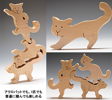それぞれの猫のユーモラスなポーズは、この積み木の最大の特徴。筆者の一番のお気に入りは、「フィーバー」と勝手に名づけた猫。片手を高々と上げたキメポーズは77年に公開されたディスコ映画「サタデーナイトフィーバー」の主演、ジョン・トラボルタそっくりだ。2匹組み合わせて「小さな恋の物語」と名づけたペアも心和む。これら以外にも、逆立ちしていたり、伸びをしていたりとポーズがバリエーションに富んでいる。