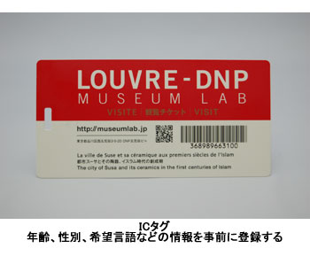 提供する情報の充実だけでなく、ラボでは情報の伝え方にも工夫を凝らす。例えば、ICタグを使った来館者ごとに異なるガイダンスの配信。まずICタグに年齢、性別、希望言語などの属性を登録する。そのICタグを首から下げて歩くだけで、館内のセンサーが反応し、その人に合わせたガイダンスを配信する、というものだ。これまで、希望観覧時間を登録すると、解説を短くするなどして観覧時間を管理したり、ICタグに記録された来館者の観覧履歴に応じてルートを案内したり、日、仏、英の3か国語から希望する言語でガイダンス配信したりといったことを行ってきた。今後、年齢別にガイダンスを配信する可能性もあるという。