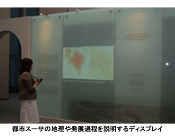 実際に展示を観て回るとラボの成果を実感できる。例えば、館内右奥に位置するディスプレイは、9?14世紀のイスラム文化圏の都市「スーサ」の地理や、発展過程を説明している。地図上に都市スーサの広がりをアニメーションで示するなど、動きのある地図を採用。音声ガイダンスも組み合わせ、わかりやすく展示されていた。