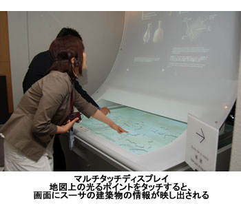 また、都市スーサの地図上の光るポイントから、好きな箇所を選んで押すと、画面にスーサの建築物の情報が映し出されるマルチタッチディスプレイを導入。従来は1人でしか操作できなかったが、複数の人が同時に操作できるように改良することで、来館者同士で会話が弾むよう配慮したという。