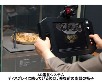 同じくAR技術を使ったものに、作品の鑑賞に使用する「AR鑑賞システム」がある。スーサの陶器の横に置かれており、A4サイズほどのディスプレイの上部にカメラがついた、美術品鑑賞用の端末だ。カメラで撮影した陶器に、修復前の3D映像を合成して、いくつかのパーツに分かれていた発掘当時の様子を見ることができる。本来は直接作品に触って見所を解説したいところだが、それは難しい。そのため、この「AR鑑賞システム」を使って作品の細かい鑑賞ポイントを指し示す。現在は1つの作品のみに活用されているが、今後は展示品全てに使用されると、作品の見所に迷うことがなく、来館者にとっては大きな魅力だ。