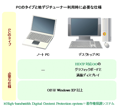 デスクトップPCの場合、さらに条件がある。内蔵するグラフィックボードと液晶ディスプレイが「HDCP」に対応していなければならないのだ。HDCPとは「High-bandwidth Digital Content Protection system」の略で、デジタル信号の経路を暗号化し、コンテンツの不正コピーを防ぐ著作権保護システムのこと。PC本体とディスプレイが対応しているかどうか、事前にしっかりと確認しておきたい。