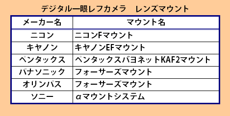 形状はメーカーによって異なっているため、通常はキヤノンのレンズをニコンのカメラに取り付けることはできない。また、各社の「レンズマウント」にはそれぞれ規格名が付けられている。そこで、現在デジタル一眼レフカメラで使われている「レンズマウント」名を挙げてみた。