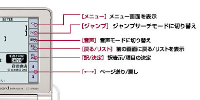 いち早くツインタッチパネルを採用し、両パネルでの漢字の手書き検索に対応したカシオ計算機は、今回新たに「メニュー」「音声」「ジャンプ」など、使用頻度の高い機能をタッチ操作で実行できる「クイックパレット」をメインパネルに装備。「音声」をタッチ後に英単語をタッチすれば、ネイティブ発音で読み上げるなど、一連の操作がスムーズに行えるようになった。