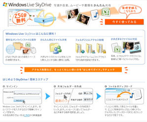 25GBと非常に大きな容量を無料で使用できるのがマイクロソフトが運営する「SkyDrive」。1ファイル50MBまでアップロード可能で、Hotmail、メッセンジャー、またはXbox LIVEのアカウントを持っていれば、すぐに利用できる。