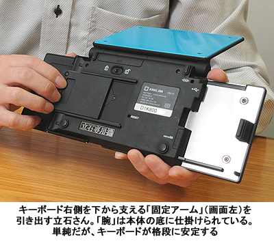 キーボードの左側には足があるが、折りたたむ構造上、右側には足がつけられない。そのため、打ち方によっては不安定になってしまう。それが悩みの種だったと立石さん。しかし、本体底部から「固定アーム」を引き出して使えば安定して使えることに気がついた。そのとき「自分の中では神が降臨したような名案だと思った」という。「引き出せばいいじゃないか!」と。ただ、普通に板を引き出してキーボードを支えるというきわめてアナログ的な構造のため、決してスマートではない。「あわててつけたわけではないけれど、確かに取ってつけた感は否めないですね」と苦笑する。