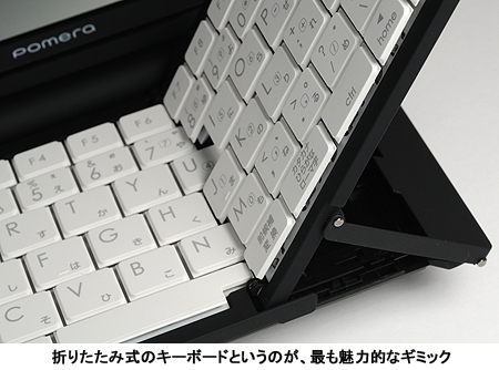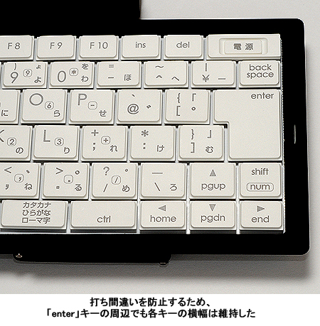 もちろん、入力のしやすさにもこだわった。ディスプレイは今時珍しいバックライトのない反射型モノクロ液晶。だが、コントラストが非常に高く、かなり暗いところでも十分に使える。数ある候補の中から、その性能の高さから「一目ぼれ」で決めた。そして、パンタグラフ式で折りたたみ可能なキーボード。キーピッチは約17mmmで、キーの横幅は均一にして、打ち間違いをしないよう配慮。適度なクリック感のあるキータッチにもこだわった。