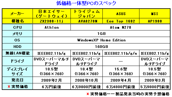5万円ノートとも呼ばれ、主に価格の安さから人気を集めている「ミニノートPC」。最近はミニノート用のCPUを使った低価格な液晶一体型デスクトップPC「低価格一体型PC」も登場している。そのうち、現在販売中の4モデルを取り上げ、その特徴をチェックしてみた。